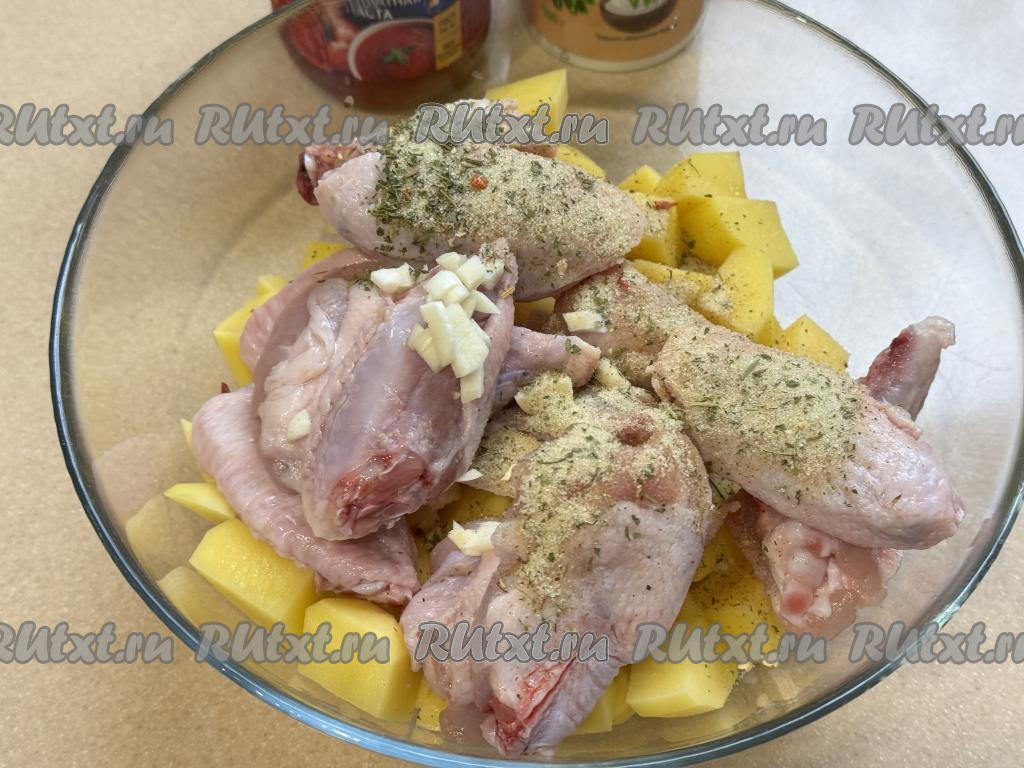 В миску с картошкой и крылышками добавить мелко нарезанный чеснок, соль и специи по вкусу (в качестве специй я добавила соль, смешанную со специями).