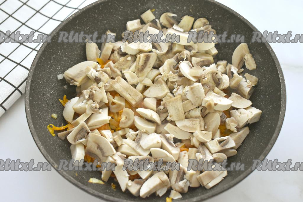 К обжаренным овощам, добавляем шампиньоны, нарезанные на небольшие ломтики, перемешиваем, обжариваем 6-7 минут, иногда перемешивая. Убираем с огня.