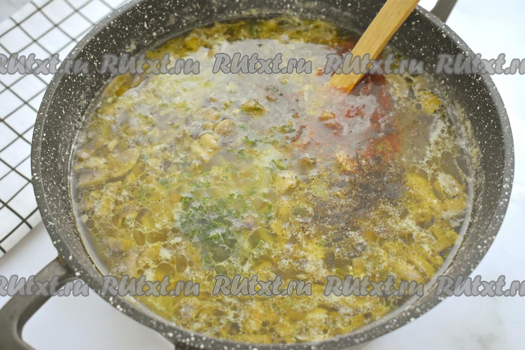 В конце приготовления приправляем щи специями (я добавила чёрный молотый перец и паприку), пробуем на вкус, если нужно, досаливаем. Добавляем нарезанную свежую (или замороженную) зелень, доводим до кипения, провариваем 2 минуты на небольшом огне. Убираем кастрюлю с огня.