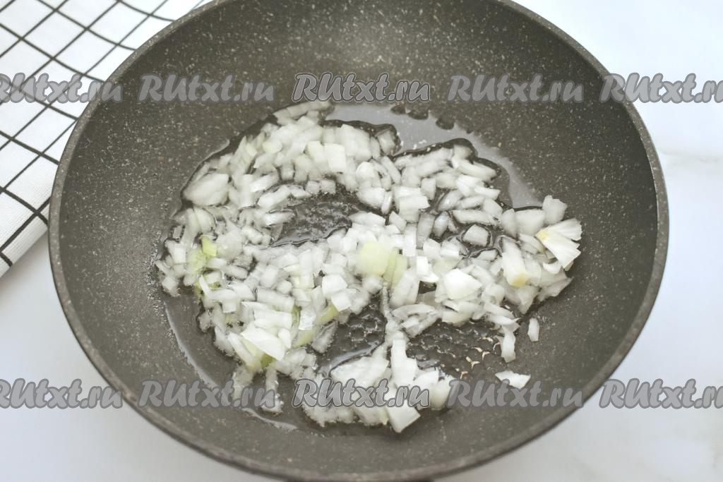 Пока картошка с капустой варятся, нужно обжарить овощи. Прежде всего очищаем лук с морковкой. Шампиньоны промываем водой. Разогреваем растительное масло в сковороде, уменьшаем огонь до среднего, выкладываем мелко нарезанный лук и обжариваем его до прозрачности (минуты 3-4), не забывая иногда перемешивать.