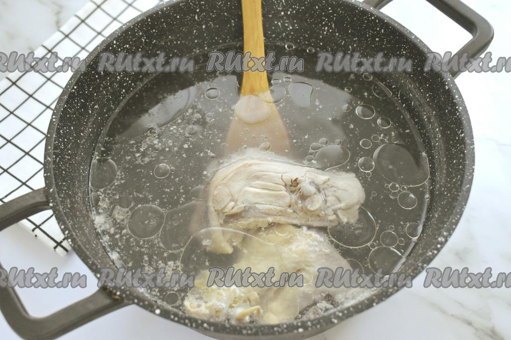 Для приготовления бульона я использовала куриные спинки, подойдут и другие части курицы (бёдра, крылья, голени). Части курицы моем, выкладываем в кастрюлю, заливаем 2 литрами холодной воды и отправляем на достаточно сильный огонь. После закипания воды аккуратно снимаем с поверхности бульона пену, уменьшаем огонь, варим мясо до готовности (минут 30-35). Сварившееся мясо достаём из бульона, даём немного остыть, отделяем его от костей, нарезаем на кусочки. Куриный бульон, если необходимо, процеживаем и сразу возвращаем в кастрюлю. В кастрюлю с бульоном выкладываем нарезанное мясо, солим, ставим на достаточно сильный огонь, доводим до кипения.
