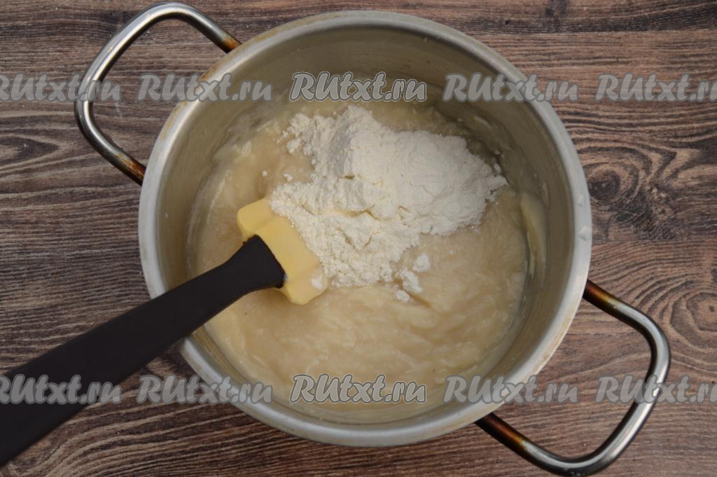 В получившуюся массу всыпать 40 грамм муки, тщательно вмешать лопаткой овощное тесто.