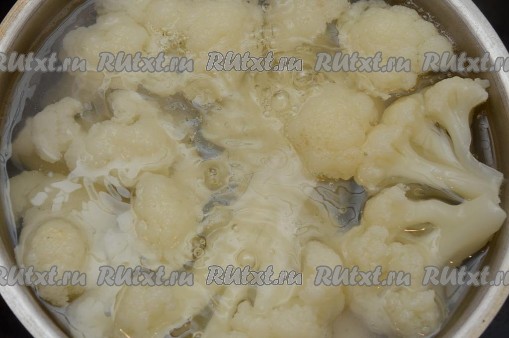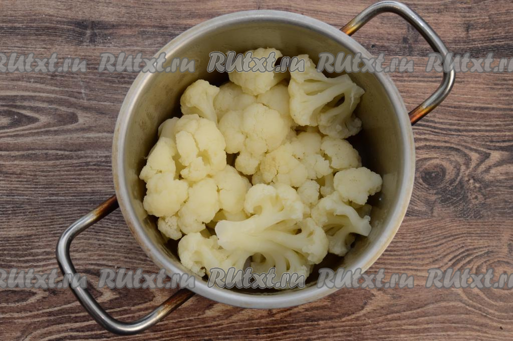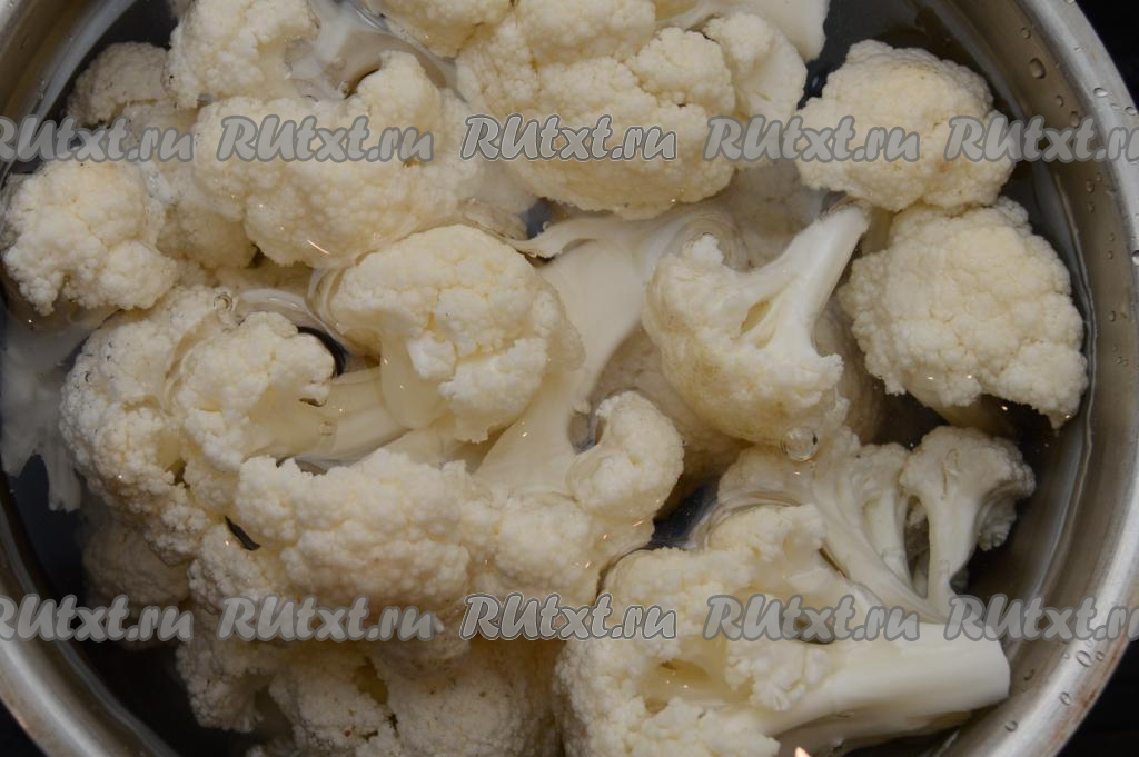 Цветную капусту промыть водой, срезать потемнения на поверхности кочана, если они есть. Разделить капусту на соцветия.