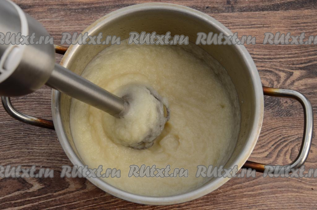 Прямо в кастрюле пюрировать цветную капусту при помощи погружного блендера до получения однородного пюре.