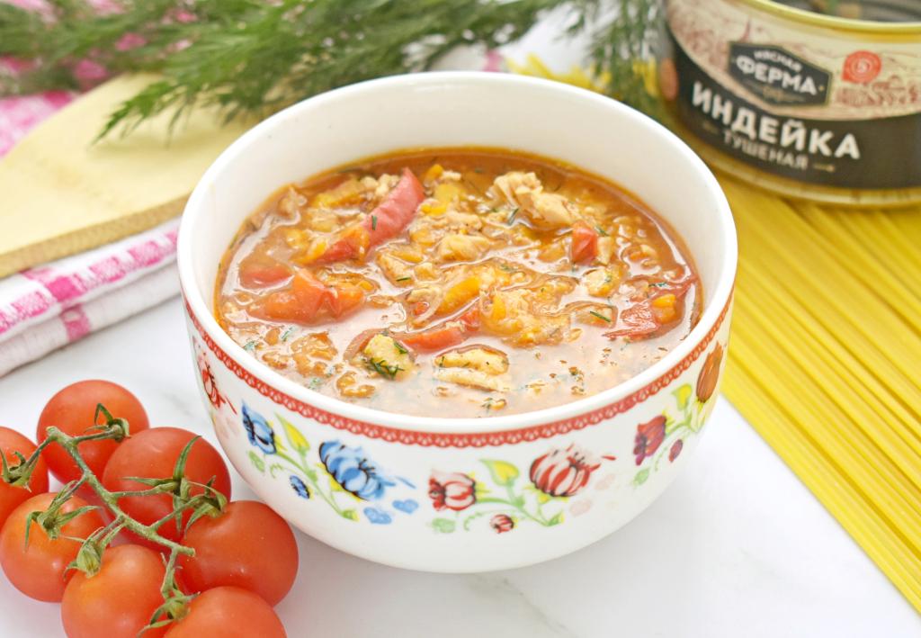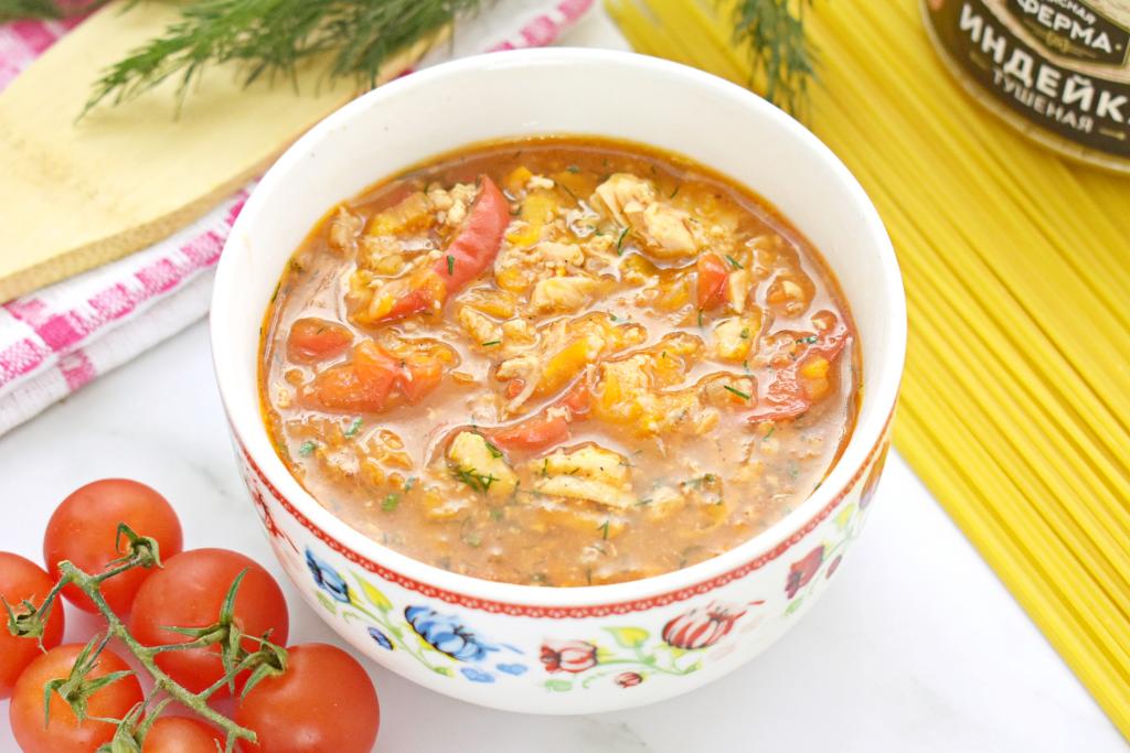 Теперь добавляем к овощам тушёнку, предварительно убрав жир (я взяла тушёнку из индейки).
