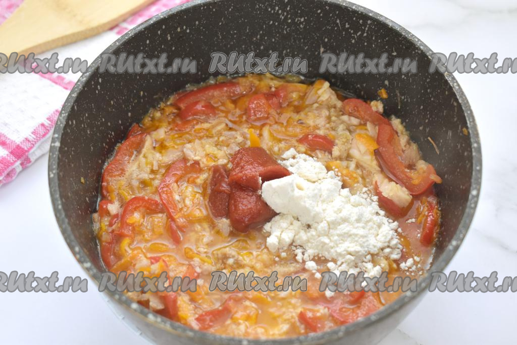 Затем к тушёнке с овощами всыпаем муку, добавляем томатную пасту, по вкусу солим и перчим, перемешиваем, тушим 1 минуту.