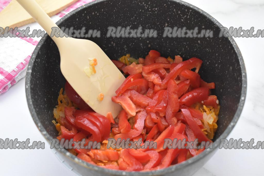 К обжаренным овощам добавляем болгарский перец, нарезанный на полоски, перемешиваем, жарим 3-4 минуты, иногда перемешивая.