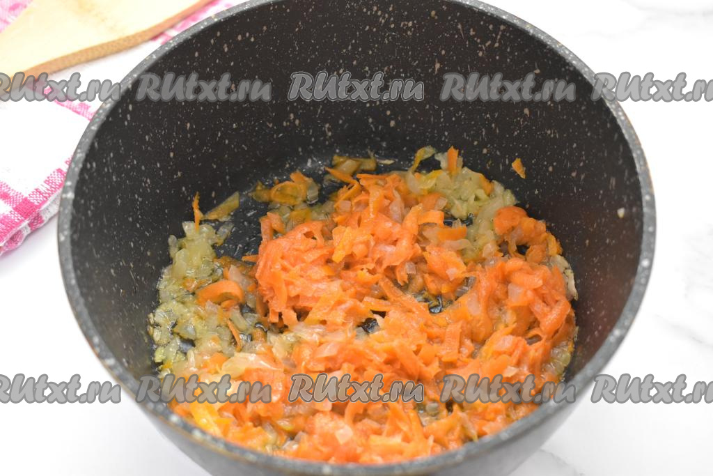 К луку, обжаренному до прозрачности, выкладываем морковку, натёртую на крупной тёрке, перемешиваем, обжариваем минут 5, время от времени помешивая.