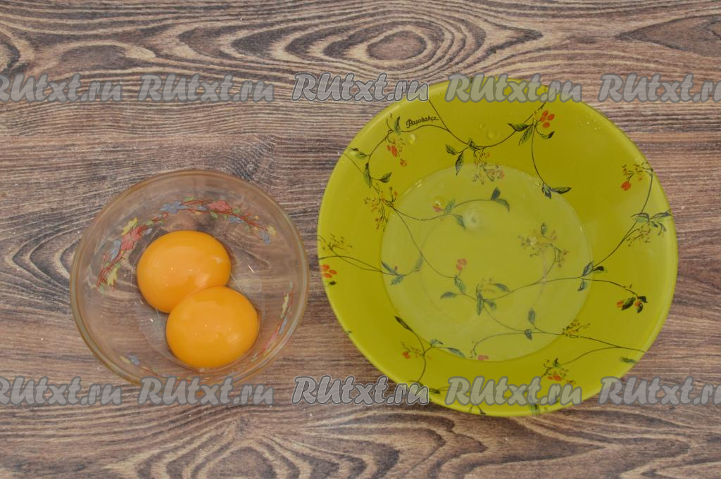 Прежде всего замесим песочное тесто. Яйца нужно аккуратно разделить на белки и желтки. Желтки будем использовать для замешивания теста. Белки нужно отложить в сторону, их мы будем использовать в начинке.