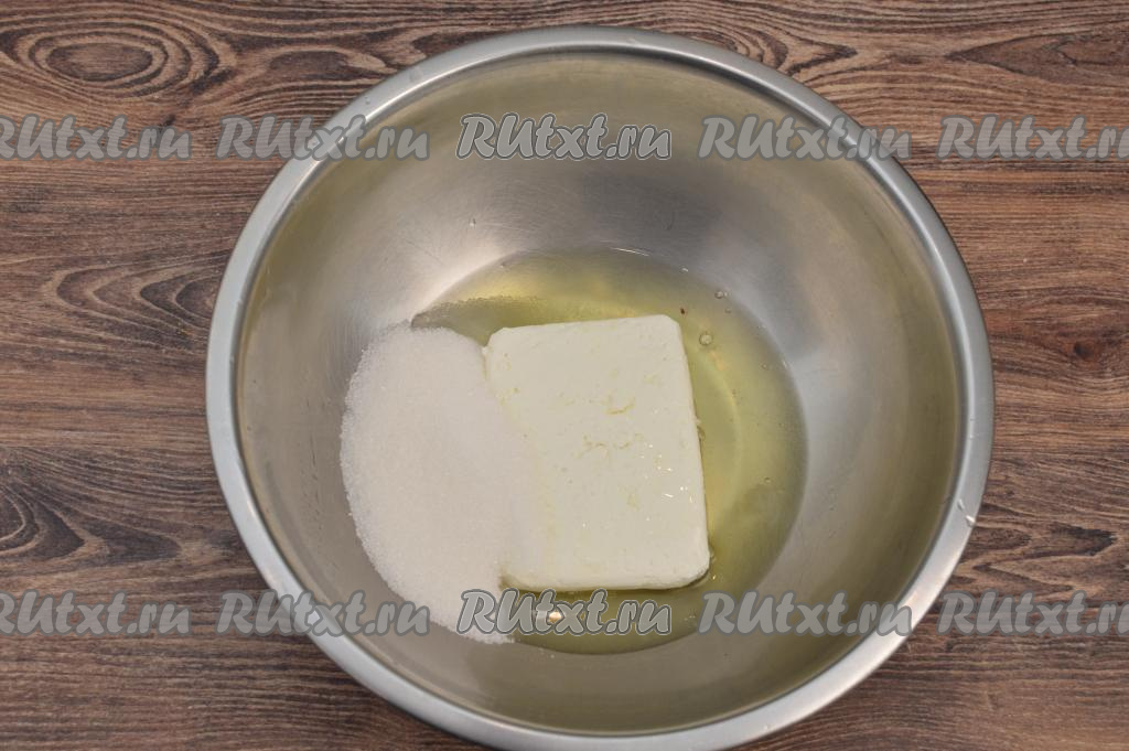 Теперь займёмся начинкой. В миску нужно выложить творог, добавить яичные белки и сахар, растереть массу сначала вилкой, а затем довести до однородности с помощью силиконовой лопаткой. Если творог у вас крупинчатый, тогда можно просто пробить творожную массу до однородности погружным блендером.