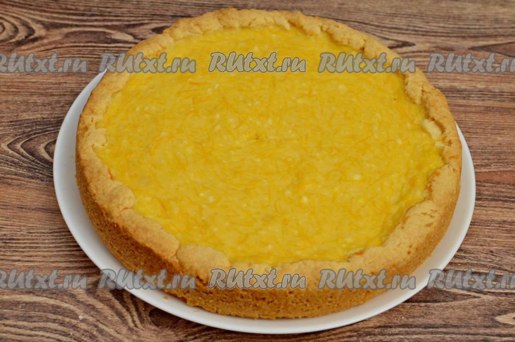 Перелить начинку из тыквы и творога в форму с песочной основой, равномерно распределить. Бортик теста можно немного подогнуть на начинку.