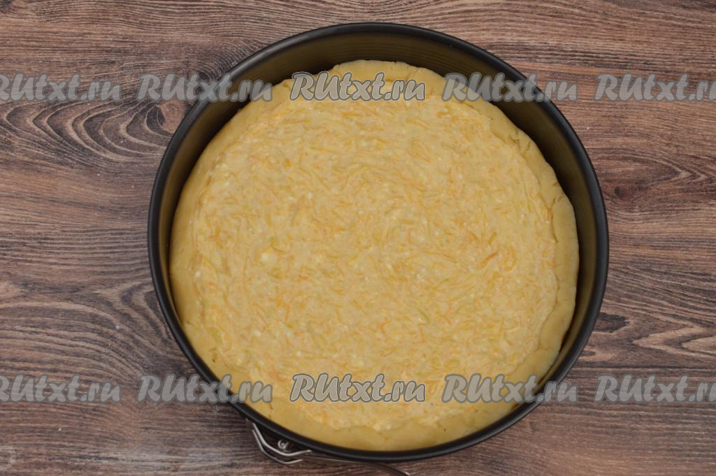 Дно и бока формы для выпечки диаметром 23 сантиметра немного смазать растительным маслом, затем выложить тесто, равномерно распределить его по дну формы, формируя небольшие бортики. Тесто на дне формы наколоть вилкой, чтобы оно меньше вздувалось во время выпечки.