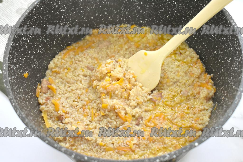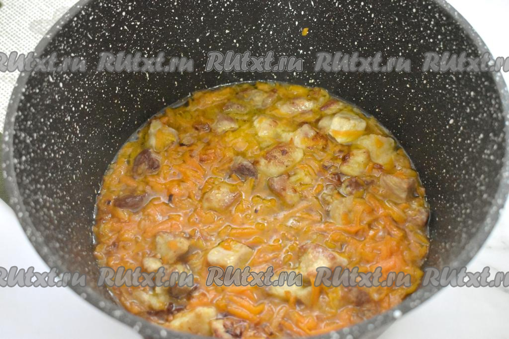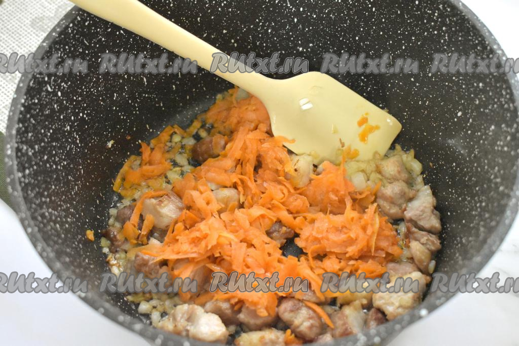 К свинине, обжаренной с луком, добавляем морковку, натёртую на крупной тёрке, перемешиваем. Обжариваем мясо с овощами 5 минут, время от времени перемешиваем.