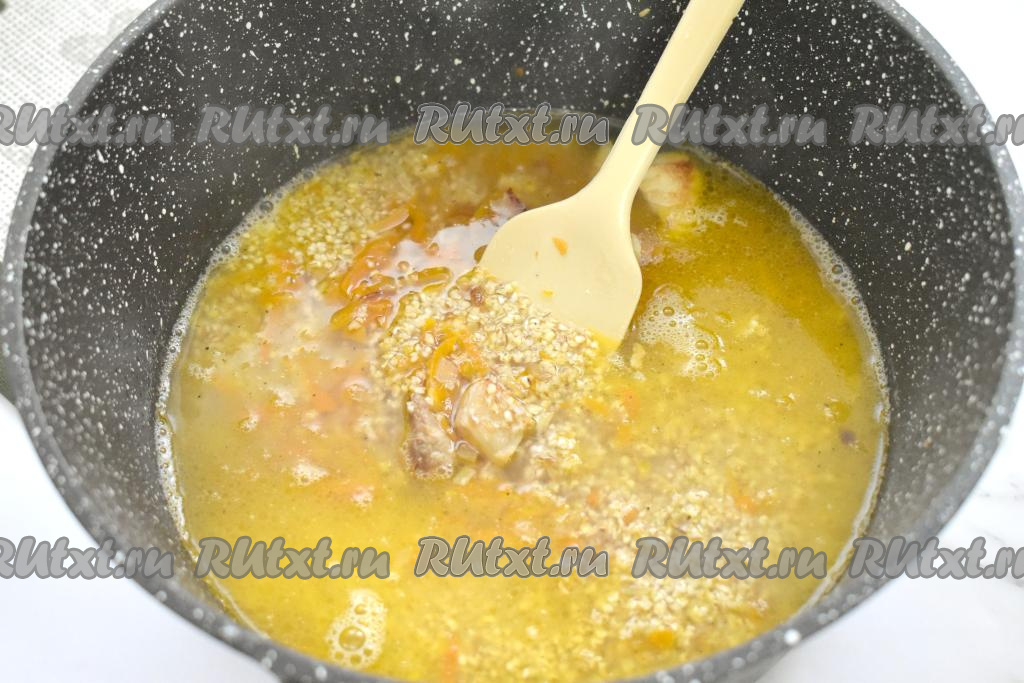 После закипания убавляем огонь до минимума и готовим ячневую кашу со свининой 20 минут (крупа должна стать мягкой), убираем с огня.
