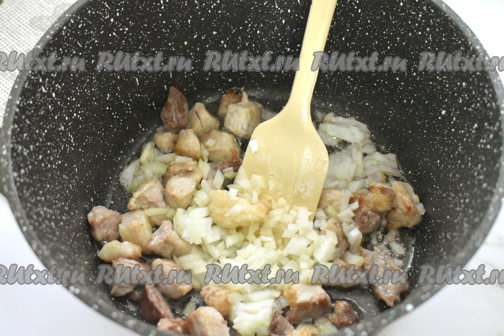 К обжаренной свинине выкладываем мелко нарезанный лук, перемешиваем, обжариваем на среднем огне, иногда помешивая, минуты 3-4.
