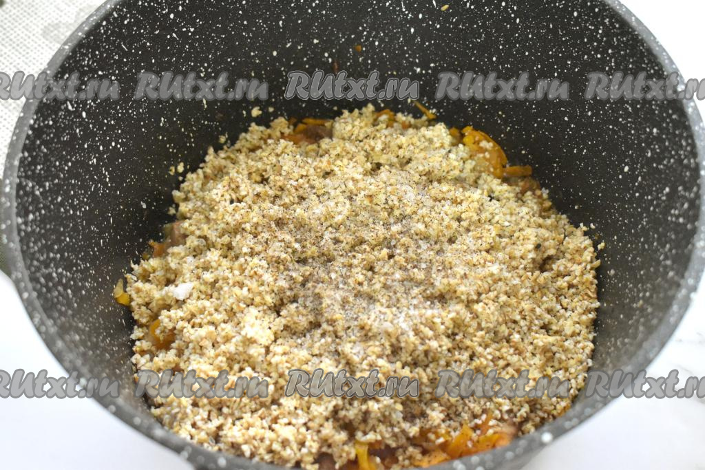 Пока тушится мясо, выкладываем ячневую крупу в сито, хорошо промываем проточной водой, даём стечь лишней жидкости. После того как свинина с овощами с момента закипания воды протушится 10 минут, добавляем к ним подготовленную ячневую крупу, по вкусу солим и перчим.