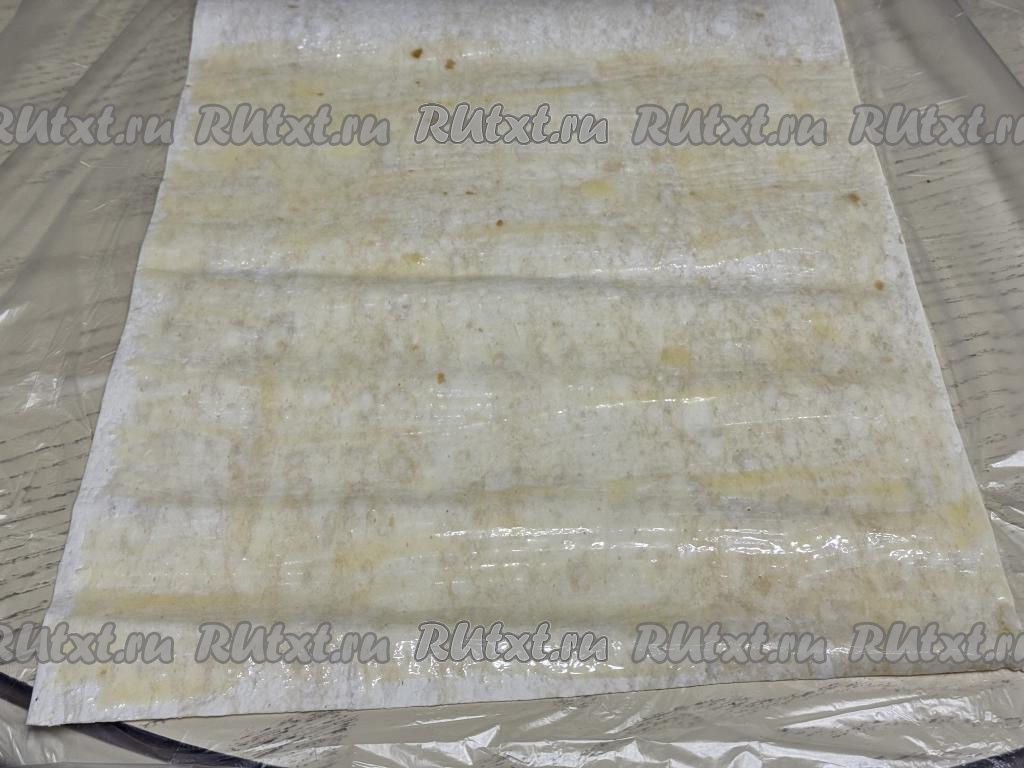 Сливочное масло растопить, дать ему немного остыть. На столе расстелить лист лаваша, смазать его растопленным маслом.