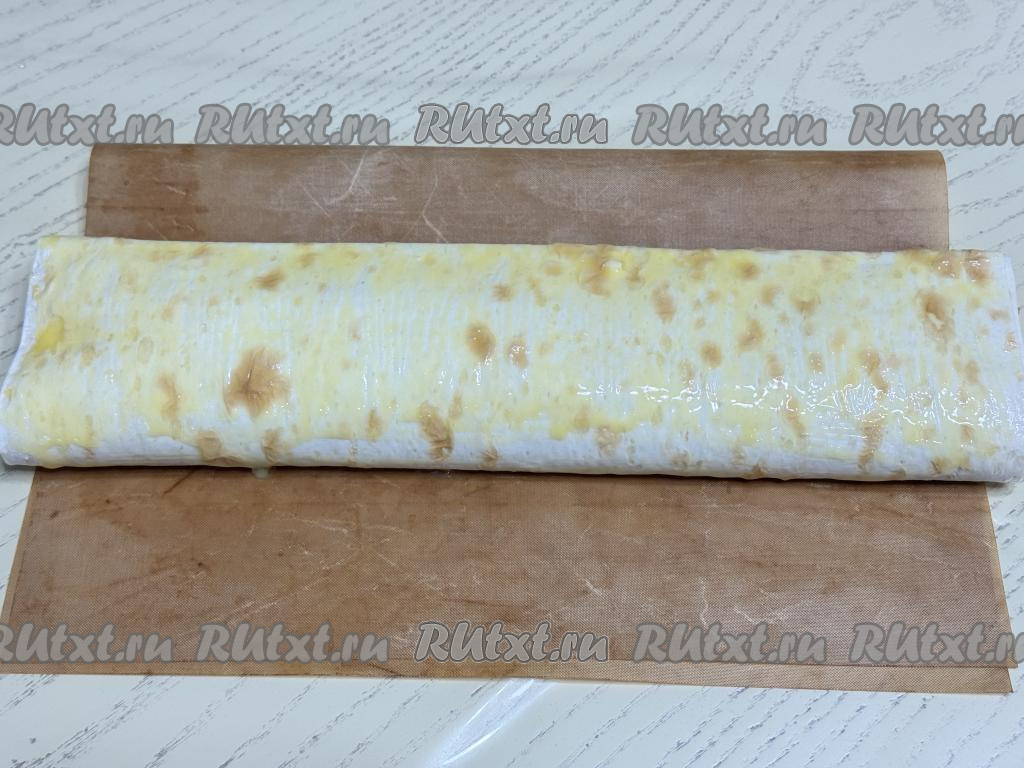 Сформированный рулет с тыквой выложить на противень, застеленный ковриком (или бумагой) для выпечки. В небольшой ёмкости яичный желток взбить вилкой до однородности, а затем получившейся смесью смазать поверхность рулета из лаваша.