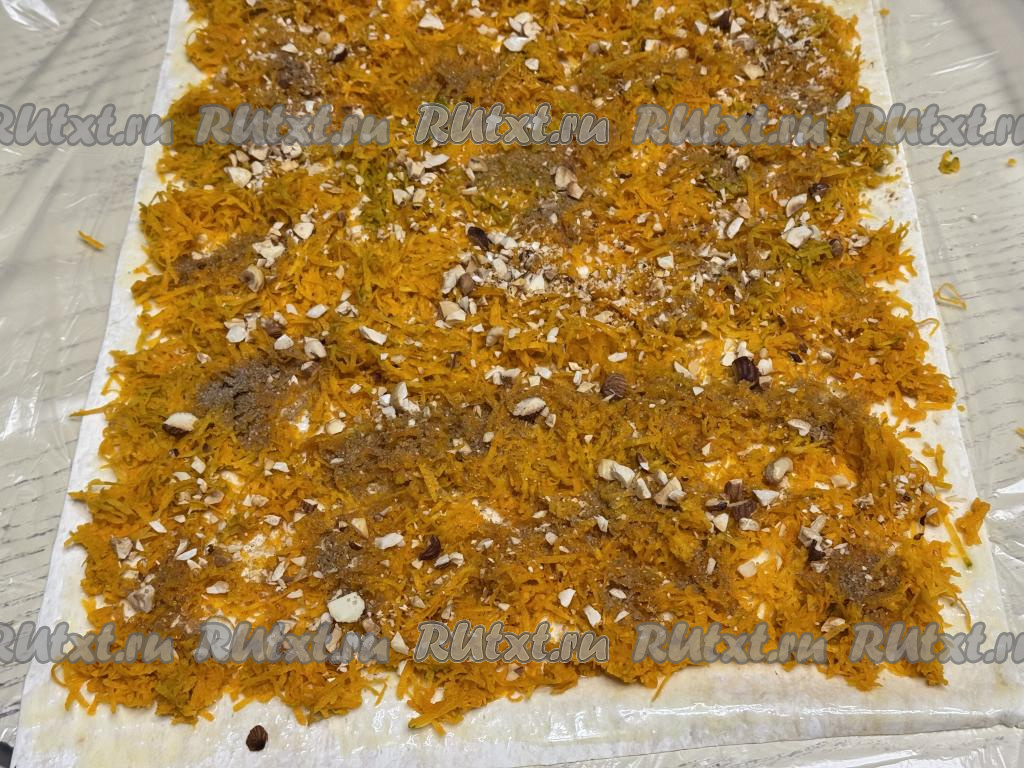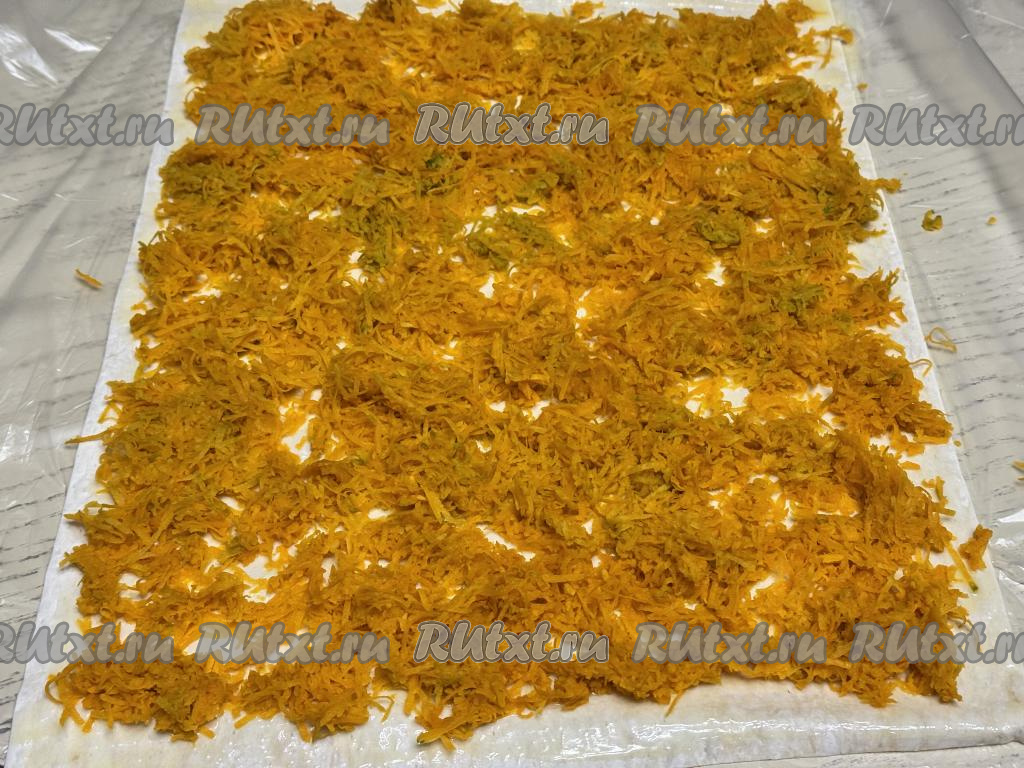 Отступая от краёв лаваша по 1 сантиметру, равномерно распределить по лавашу натёртую тыкву.