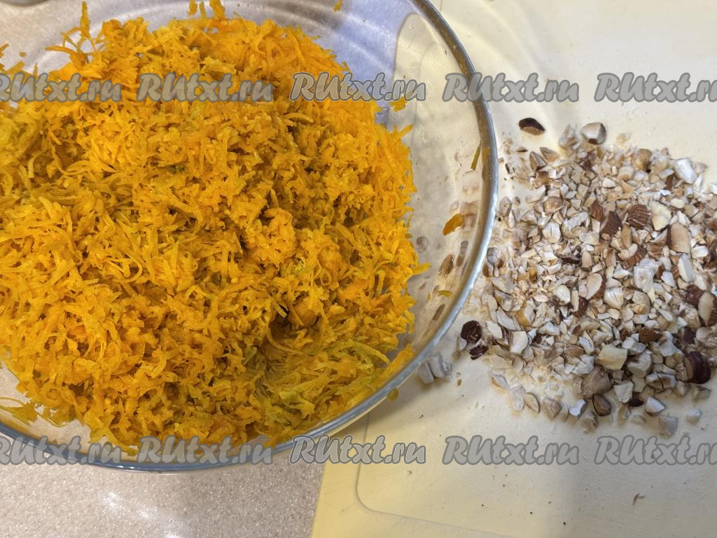 400 грамм тыквы, заранее очищенной от кожуры и волокон с семечками, натереть на мелкой тёрке в глубокую миску. Орехи, если будете использовать, нужно измельчить ножом в крошку.