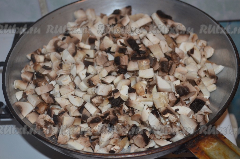 Шампиньоны порезать мелко, обжарить 5-7 минут, посолить и поперчить по вкусу.