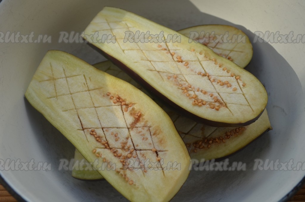 Баклажаны помыть, разрезать вдоль на половинки, сделать глубокие надрезы на мякоти, присыпать солью, оставить на 20-30 минут.