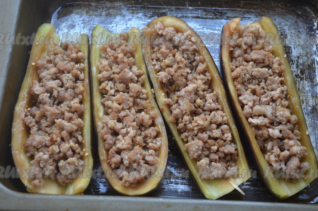 В "лодочки" из баклажанов выложить первым слоем мясной фарш с луком.