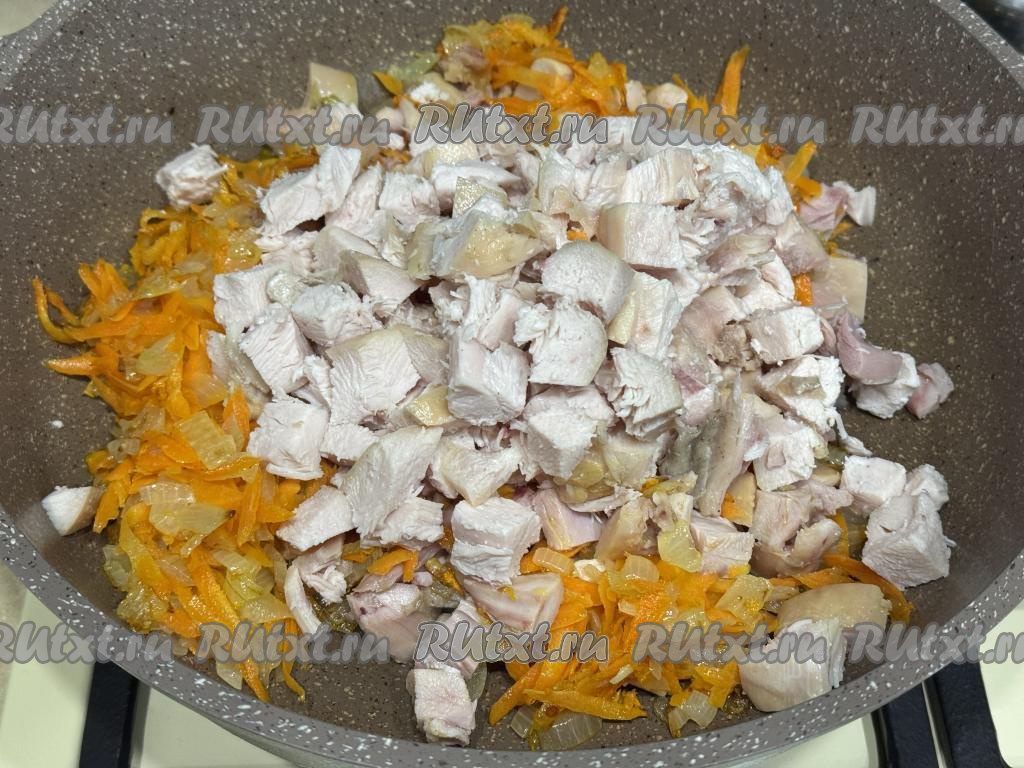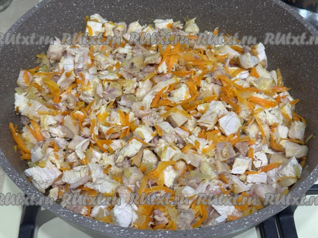 Обжарить морковь с луком вместе в течение 5-7 минут (до мягкости морковки). К обжаренным овощам добавить мясо копчёной курицы, нарезанное на средние кубики.