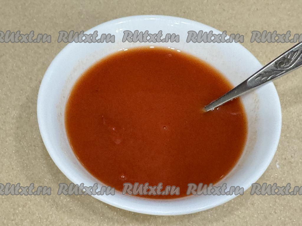 В глубокую тарелку выложить томатную пасту, влить 100 миллилитров воды, перемешать получившийся томатный соус.