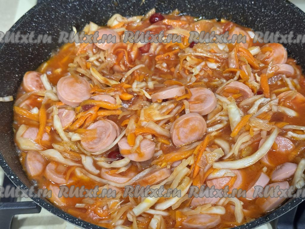 В сковороду с морковкой, луком и сосисками добавить квашеную капусту, влить получившийся томатный соус.