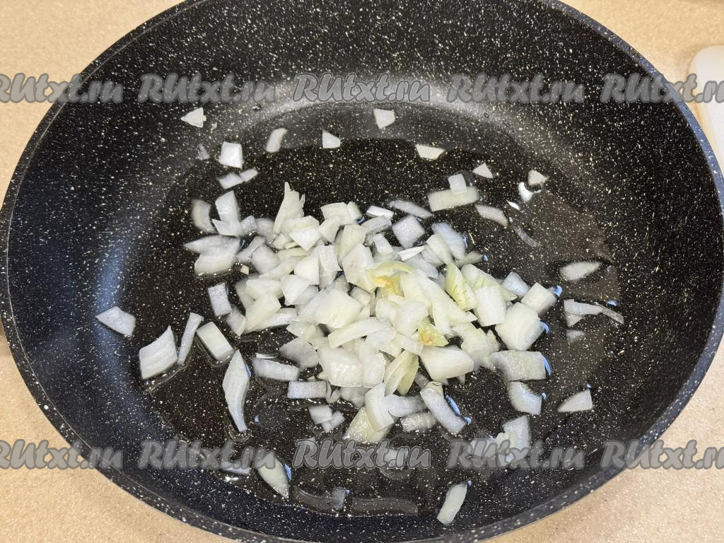 В сковороду влить растительное масло, хорошо его разогреть и только после этого выложить мелко нарезанный лук.
