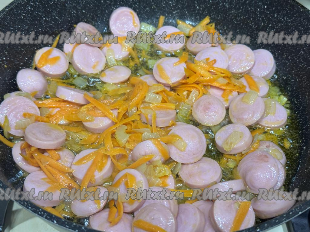 Обжарить овощи в течение 5-6 минут (до мягкости морковки), время от времени перемешивая. Затем к обжаренным овощам добавить сосиски, нарезанные на кружочки, перемешать.