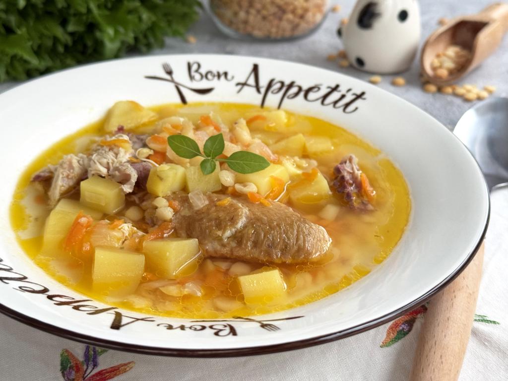 Ароматный, аппетитный, очень вкусный и насыщенный гороховый суп, сваренный с копчёной курицей, разлить из чаши мультиварки по тарелкам и в горячем виде подать к столу.