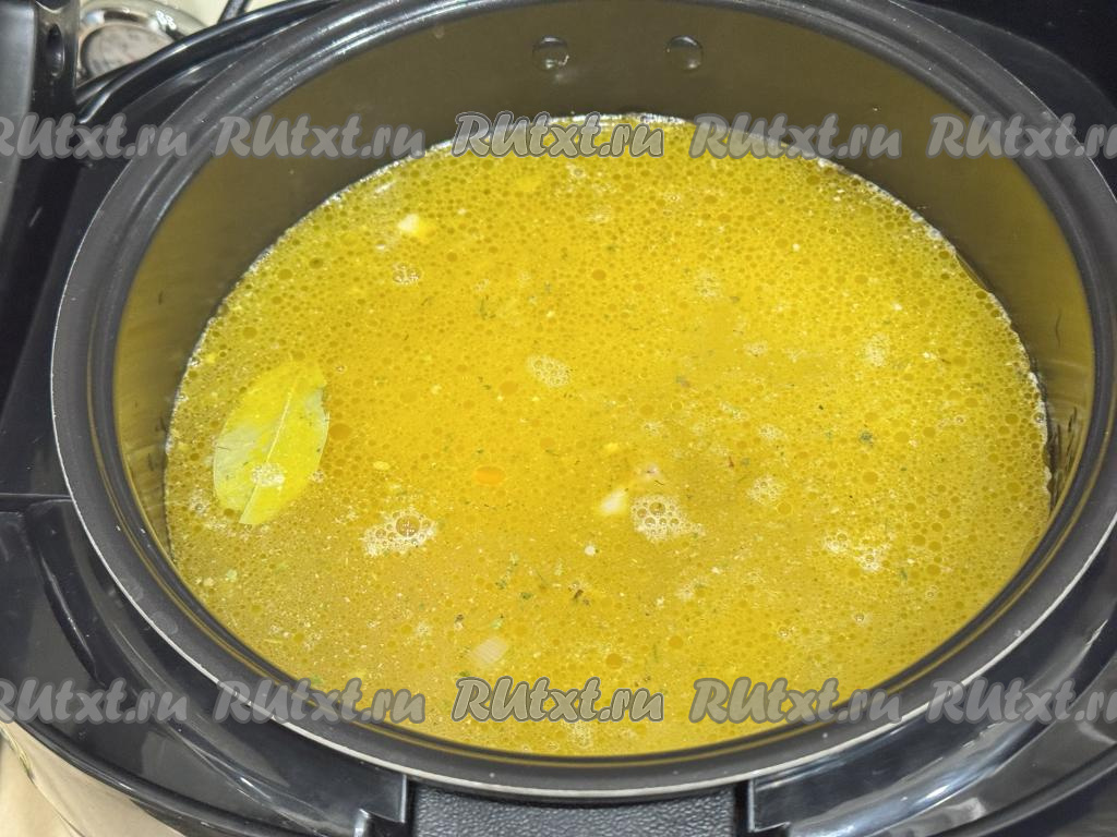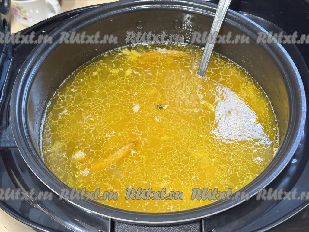 Закрыть крышку мультиварки, выставить режим "Суп" на 1 час. Готовить гороховый суп с копчёной курицей до звукового сигнала, сообщающего об окончании режима.