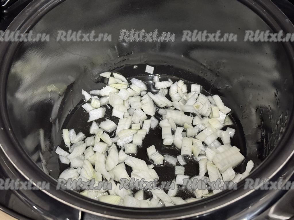 В чашу мультиварки влить растительное масло, выставить режим "Жарка" на 10 минут, выложить мелко нарезанный лук.