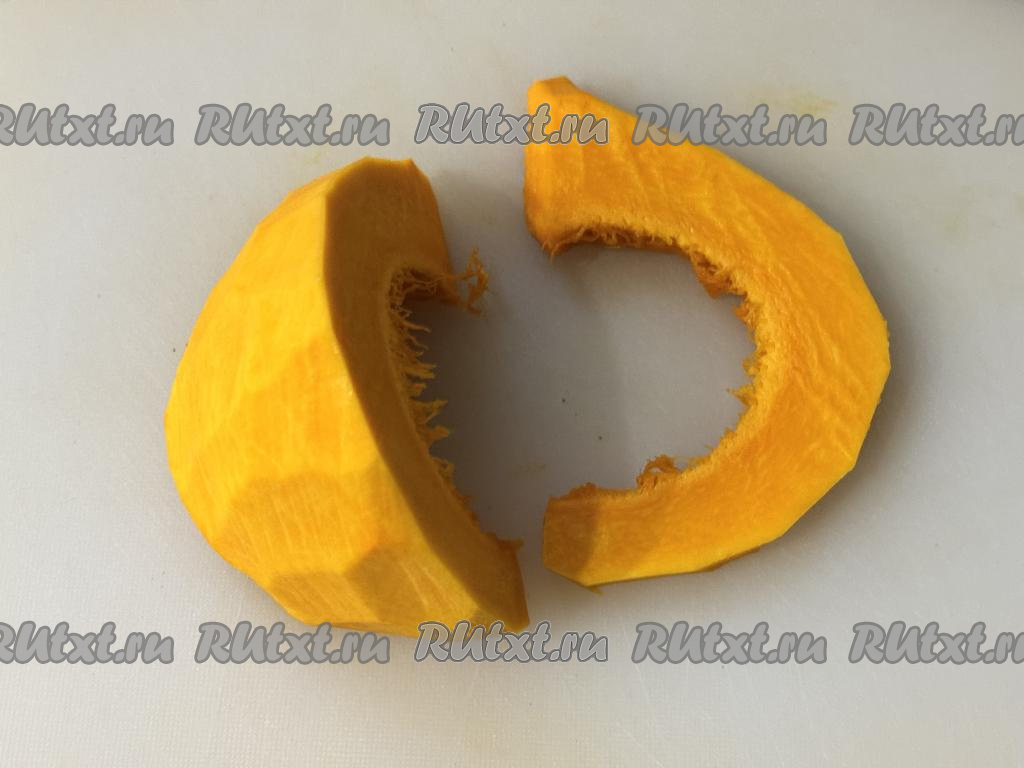 Очистить тыкву от кожуры, волокон и семечек. 300-400 грамм очищенной тыквы нарезать на ломтики толщиной примерно 1 сантиметр.