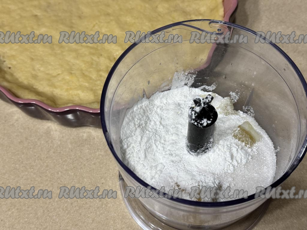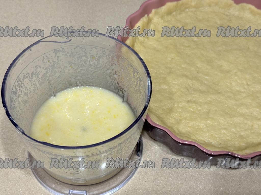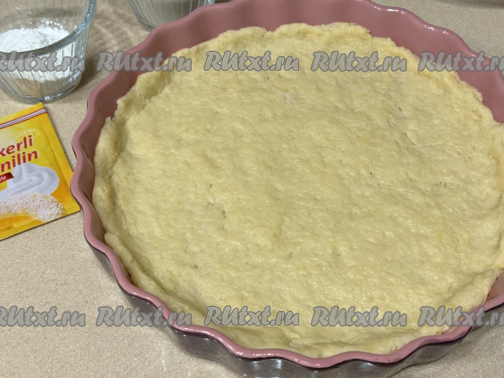 Разделить тесто на две части. Одну часть поместить в целлофановый пакет и убрать в морозилку на 30 минут. Вторую часть теста выложить в форму для выпечки и распределить по форме, сформировав невысокий бортик.