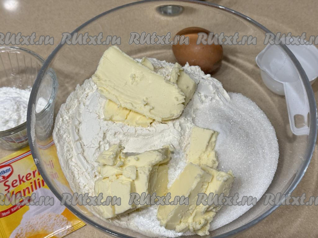 Сливочное масло достать из холодильника, нарезать на кусочки и сразу выложить в миску с сухими ингредиентами.