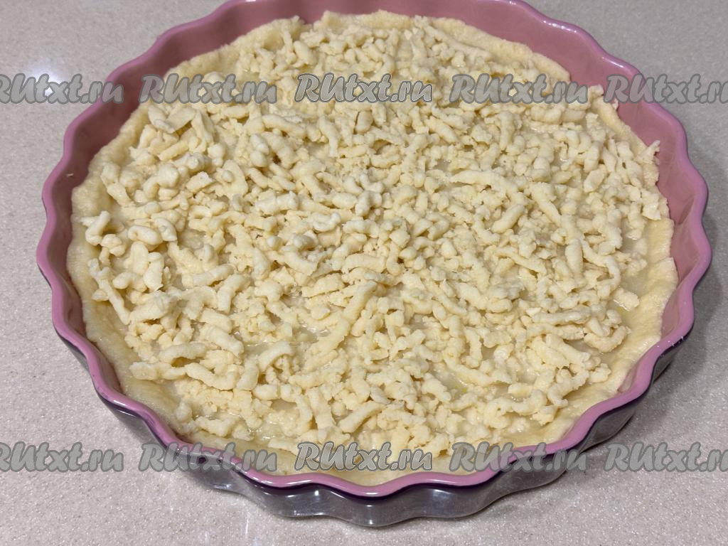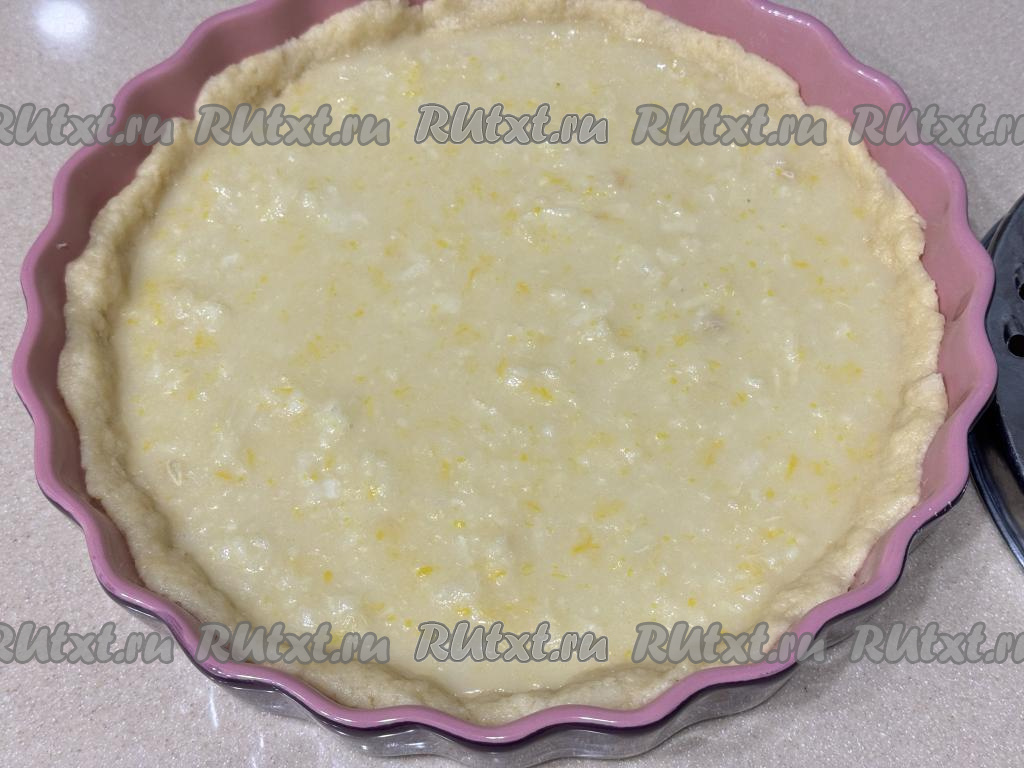 Достать тесто из морозилки, натереть его на крупной тёрке. Равномерно выложить натёртое тесто поверх начинки, покрывая весь лимонный слой.