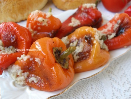 Вкусный ароматный жареный болгарский перец с пикантным чесночным соусом готов.