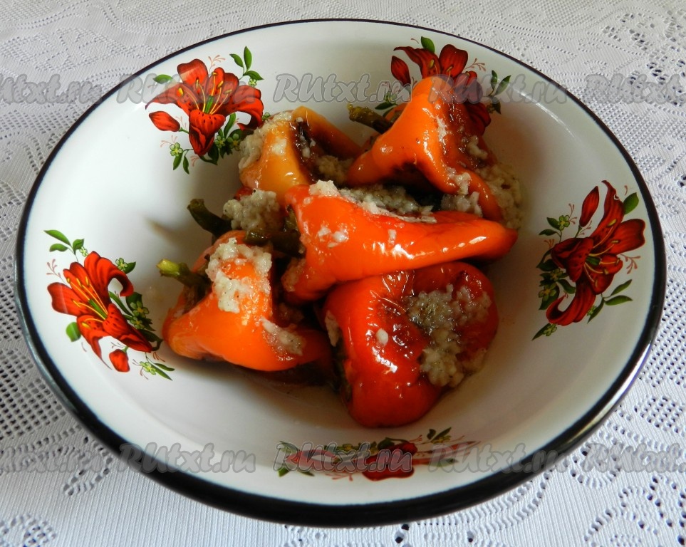 Залить болгарские перчики чесночным соусом, накрыть крышкой и оставить на 20 минут.