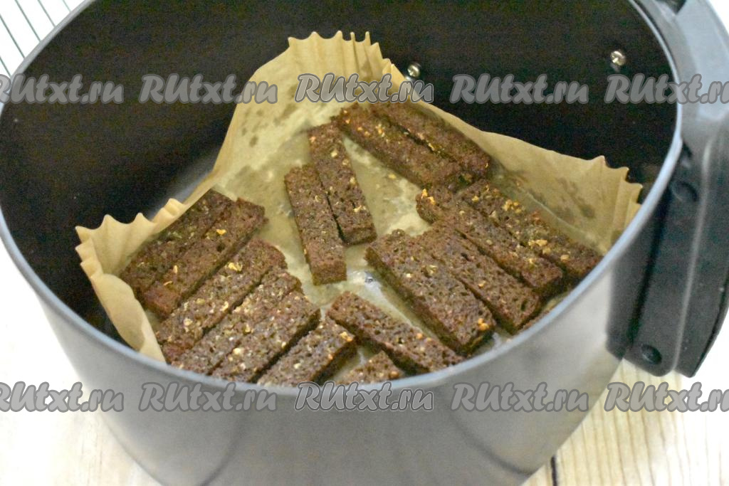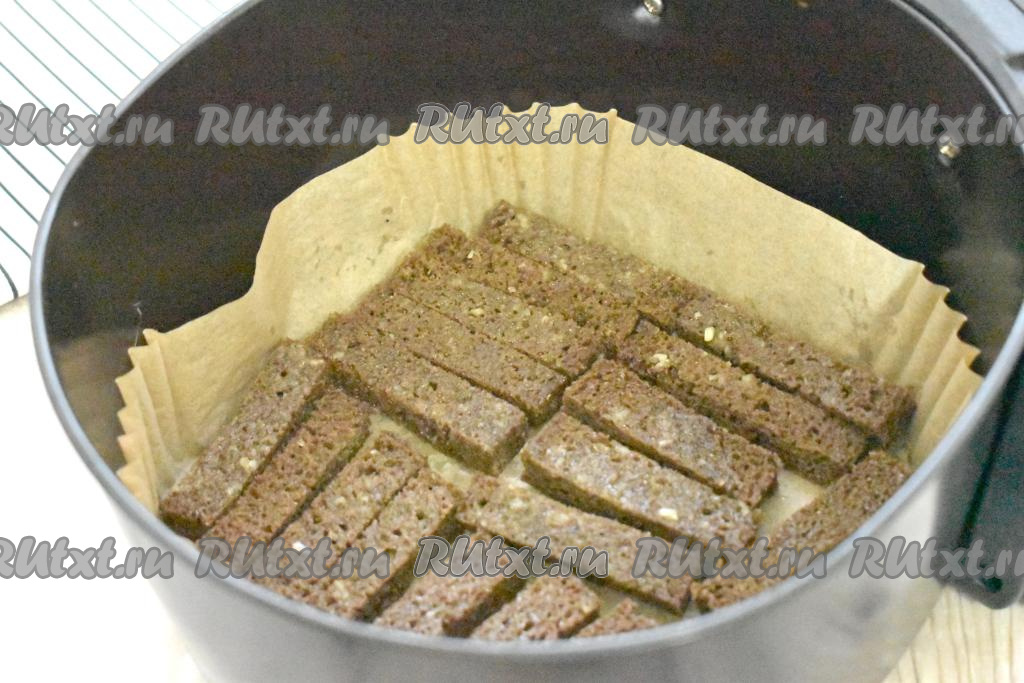 В чашу аэрогриля, предварительно застеленную пергаментом, выкладываем брусочки хлеба так, чтобы сторона хлеба, смазанная чесноком, была сверху.