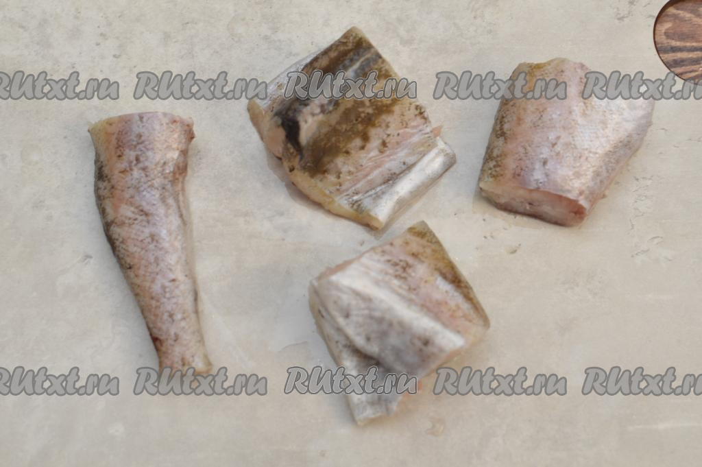 У размороженного минтая отрезать хвост с плавниками, разрезать брюшко, удалить из него внутренности вместе с чёрной плёночкой. Тщательно промыть рыбу водой. Нарезать минтая на части.