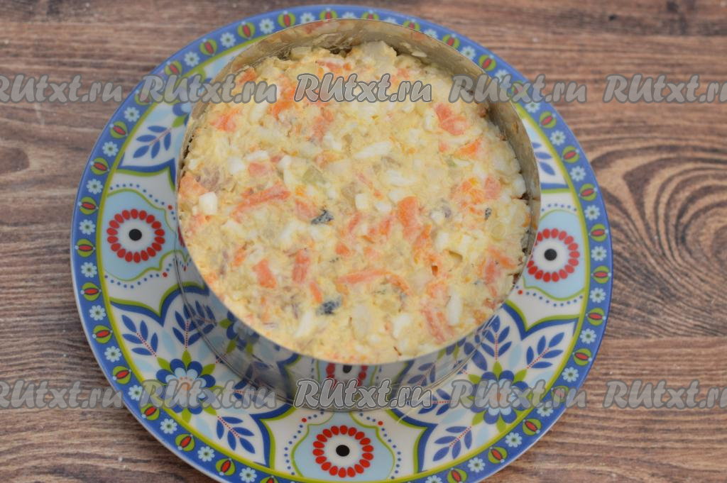 Подавать этот салат можно в салатнике. А я решила выложить рыбный салат в кулинарное кольцо, предварительно поставив его на плоскую тарелку. Поставить тарелку с кольцом с салатом в холодильник минут на 30, чтобы блюдо немного охладилось.