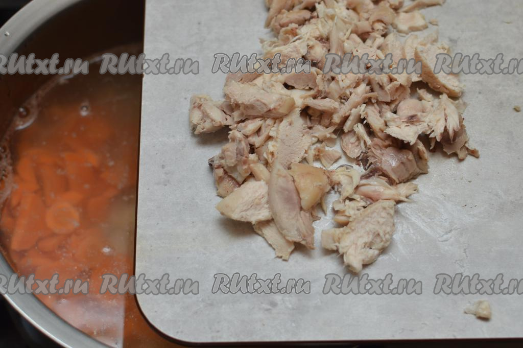 Остывшие части курицы отделить от костей, нарезать на кусочки, добавить в суп следом за морковью.
