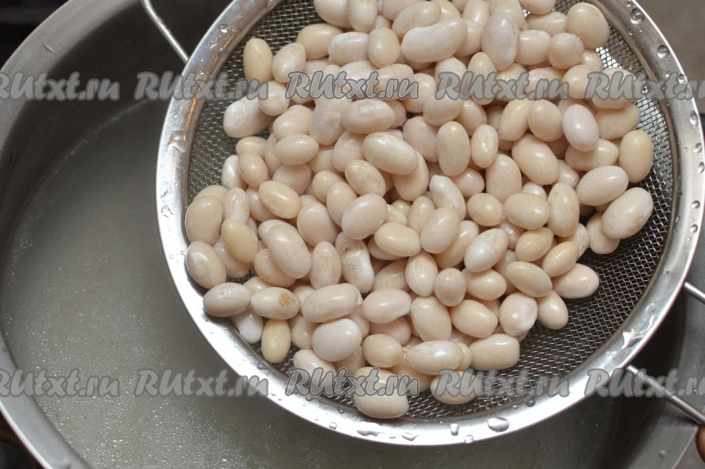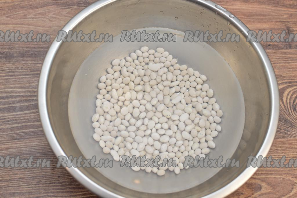 Для того чтобы сухая фасоль сварилась быстрее, желательно замочить её с вечера. Для этого нужно взять 190 грамм сухой фасоли (это примерно 1 стакан объёмом 200 миллилитров), выложить в сито, хорошо промыть проточной водой, лишней воде дать стечь. Промытую фасоль выложить в глубокую миску, залить достаточно большим количеством воды и оставить на ночь.