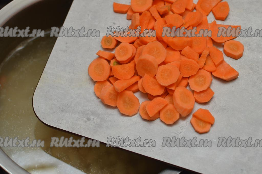 После того как фасоль сварится, добавить в кастрюлю очищенную морковку, нарезанную на достаточно тонкие кружочки (или полукружочки). В этот суп я добавляю достаточно много морковки, она делает фасолевый суп более ярким.