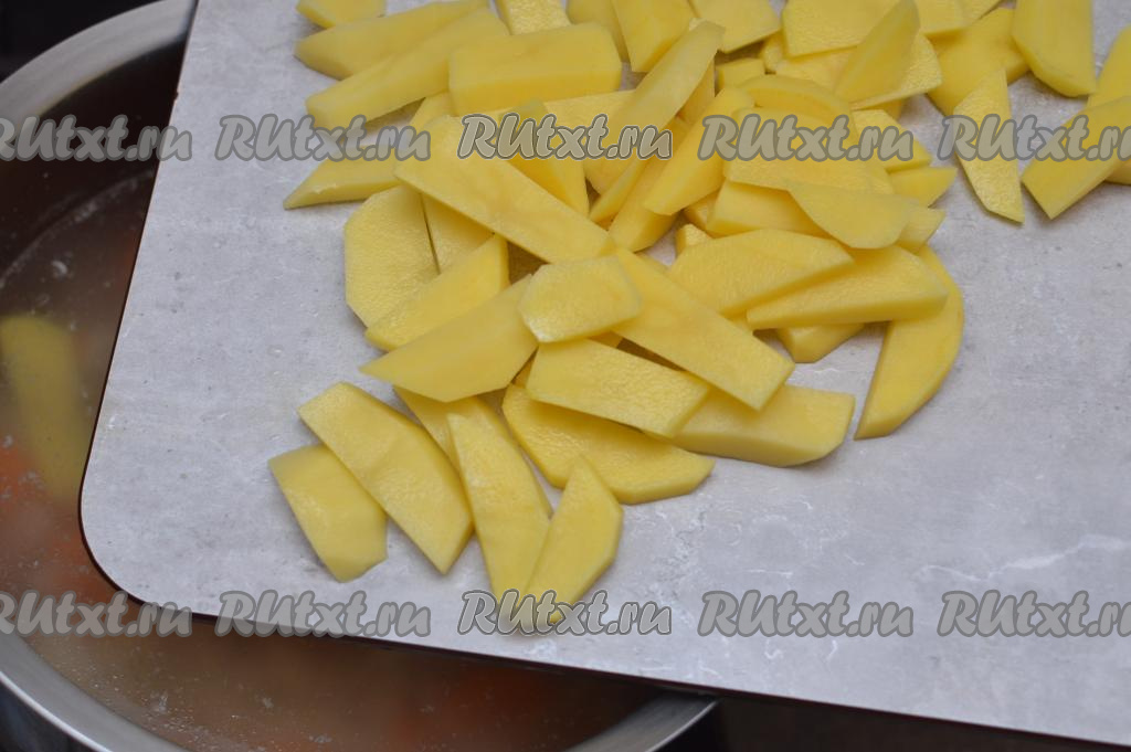 Сразу же выложить в кастрюлю и очищенный картофель, нарезанный на средние брусочки.