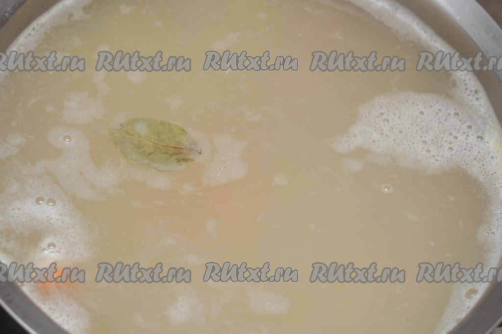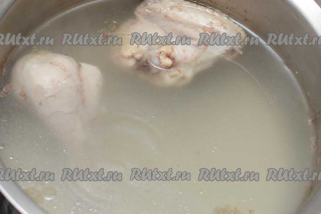 Для того чтобы сварить бульон, нужно вымытые кусочки курицы (я взяла ножку и крылышко) выложить в кастрюлю, залить 2 литрами воды, поставить на сильный огонь, после закипания, убрав с поверхности пену, варить бульон на небольшом огне 30 минут (до готовности мяса).