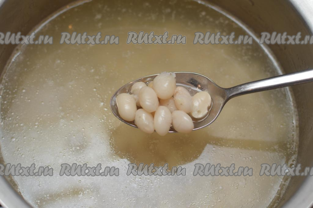 Варить до готовности фасоли (она должна стать достаточно мягкой, но не разваренной), прикрыв кастрюлю крышкой. Солить на этом этапе бульон не нужно. Продолжительность варки, в зависимости от сорта фасоли, может быть от 40 минут до 1,5 часов. У меня фасоль стала полностью готова по прошествии 45 минут с момента закипания.